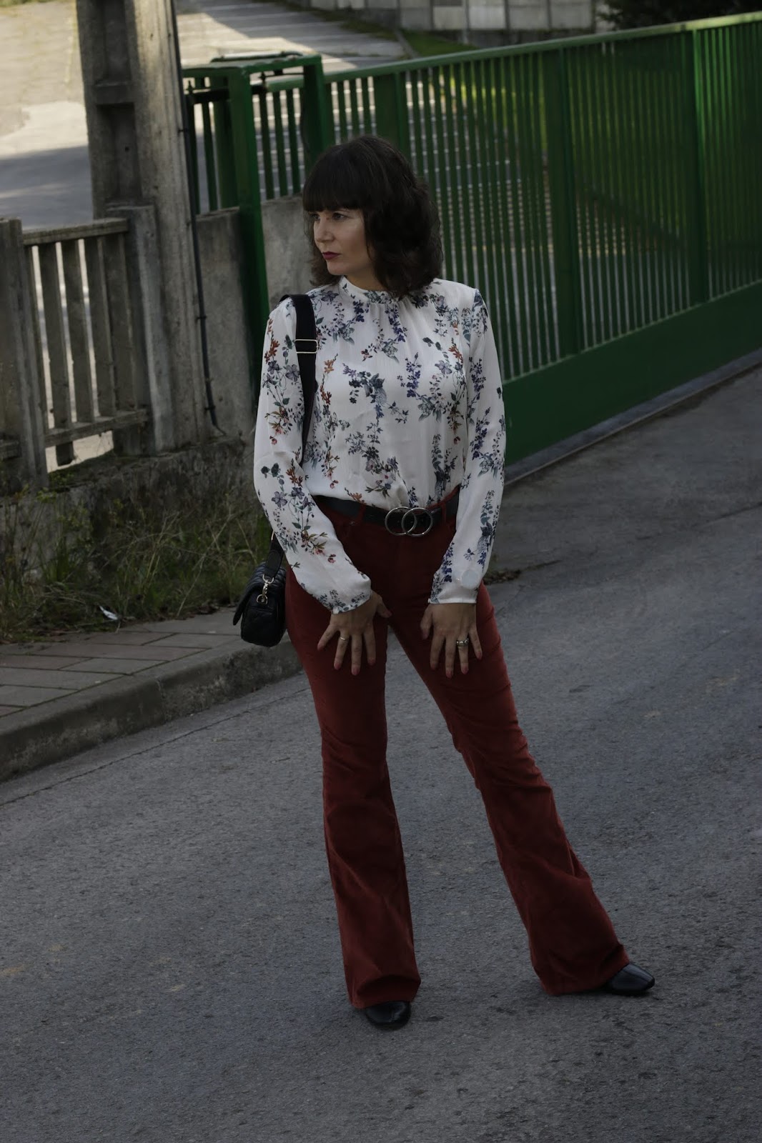 Como la pana me resulta bastante basta lo he acompañado de una blusa satinada con estampado floral y complementos en negro.